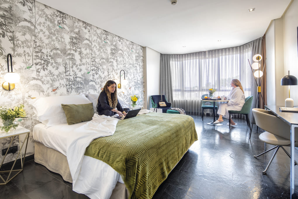 Upon entering ApartoSuites Jardines de Sabatini, one is enveloped in an atmosphere of art. Alongside Fernandes’ artwork, the installations created by the urban art collective Boa Mistura can be found in various locations throughout the building, including the expansive graffiti piece “Del Corazón al Cielo” (From the Heart to the Sky), which spans 62 square meters. The contributions of painter Cristina Gamón in the hotel lobby and breakfast area, along with Oscar Vautherin’s sculptures flanking the entrance and the piece titled “Five Left Feet” at the reception, round out the impressive roster of artists featured here.